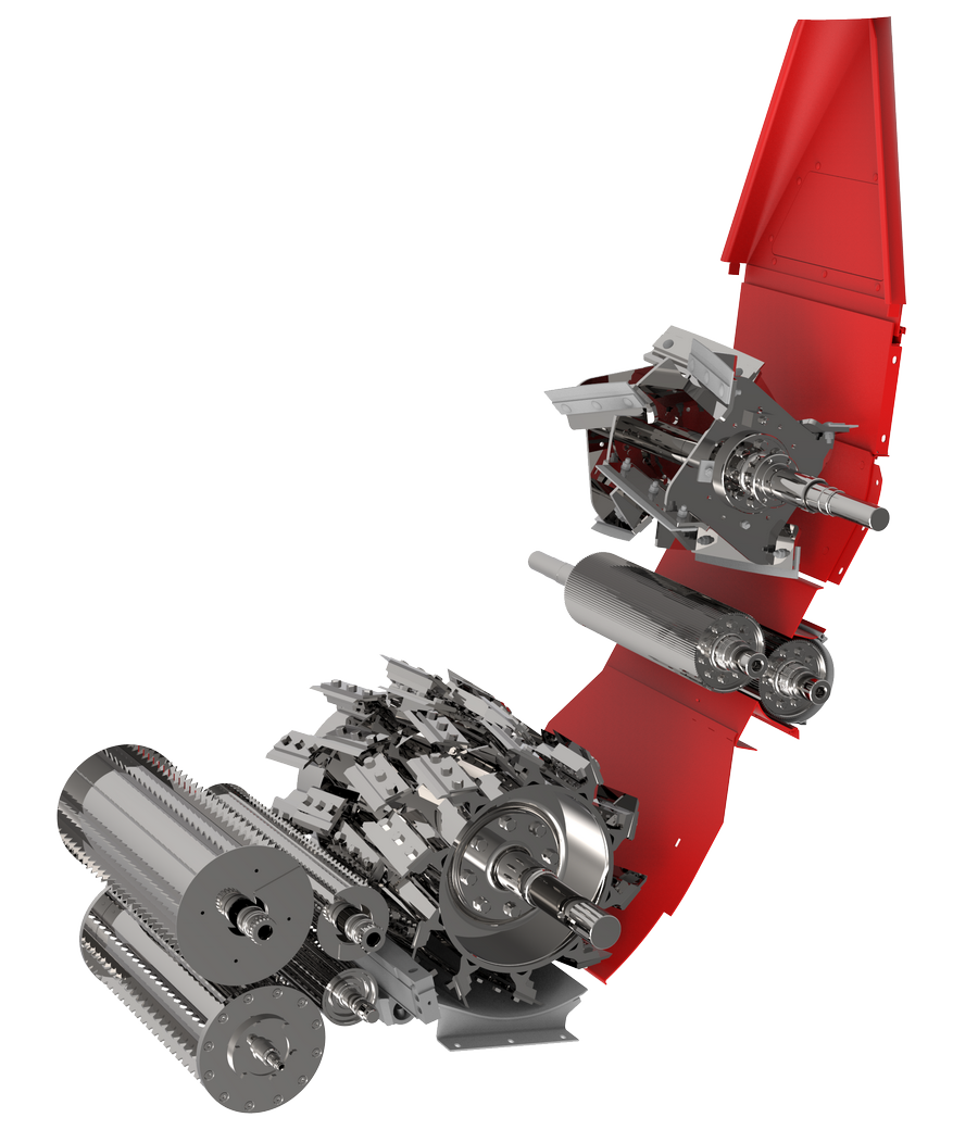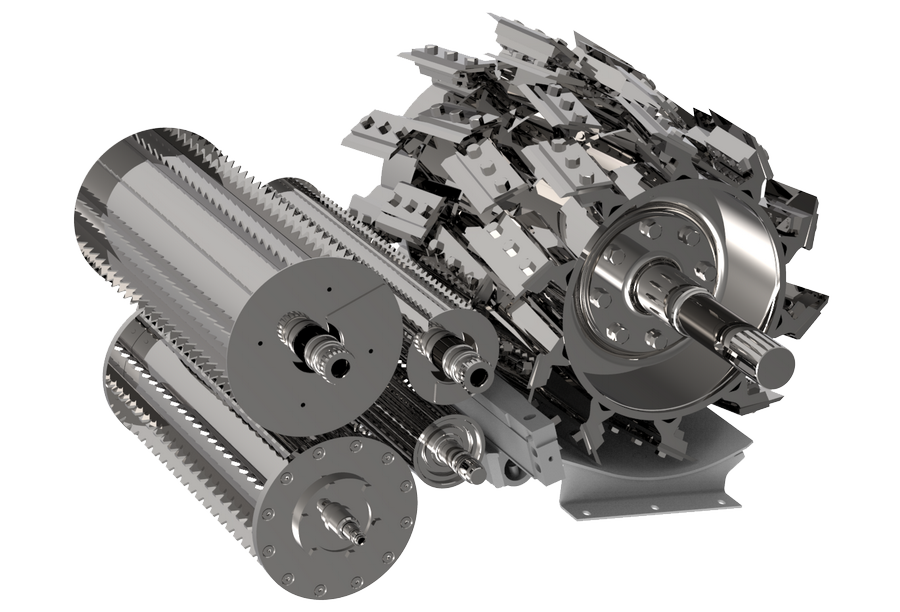 Універсальны здрабняльны барабан MULTI DRUM з 4 шэрагі нажоў, спецыяльна распрацаваны для эфектыўнага і эканомнага рэзання. Дзякуючы асабліваму вуглу размяшчэння нажоў адносна процірэжучага бруса забяспечваецца касой і чысты зрэз са зніжэннем выдаткаў энергіі на рэзанне. Нажы дзякуючы вуглу нахілу ссоўваюць масу ад краёў да цэнтра барабана, памяншаючы трэнне масы аб сценкі тэхналагічнага тракта, тым самым зніжаючы знос і павялічваючы эфектыўнасць тэхналагічнага працэсу.